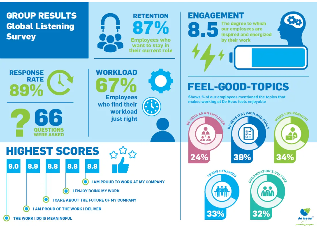 "Apart from the response rate, engagement scores were extremely high across the different parameters. As I said, I've never seen anything like it. A very high number of people feel engaged with De Heus, are proud to work here and have no intention of working anywhere else. Our Net Promoter Score was also very high. People feel heard, supported and equipped with the right resources to do their job. They feel they can speak up if something's wrong and that they make a difference when it comes to achieving the company's business goals. They also feel fairly compensated for the work they put in. It's almost embarrassingly positive. I think this is because employees understand our strategy and objectives and their role in achieving them."