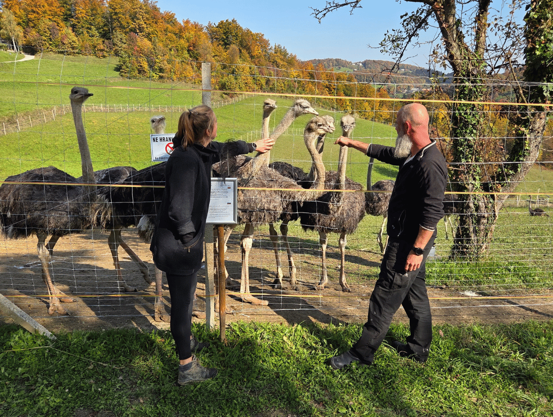 For Niels van Gerven and Kirsten Claessens, life used to look very different. Born in the Netherlands, Niels worked as an optometrist while Kirsten built her career as a process manager in international companies. In 2016 they met, discovered they shared the same dreams, and soon imagined a new life — one closer to nature and far away from the daily rush. During a holiday in Slovenia in 2018, they fell in love with the landscape and the peacefulness of the Savinja region. In 2024, they took the leap. They sold their home in the Netherlands, moved to a secluded farmstead in the village of Blatni Vrh, and started building something completely new: their own ostrich farm.
