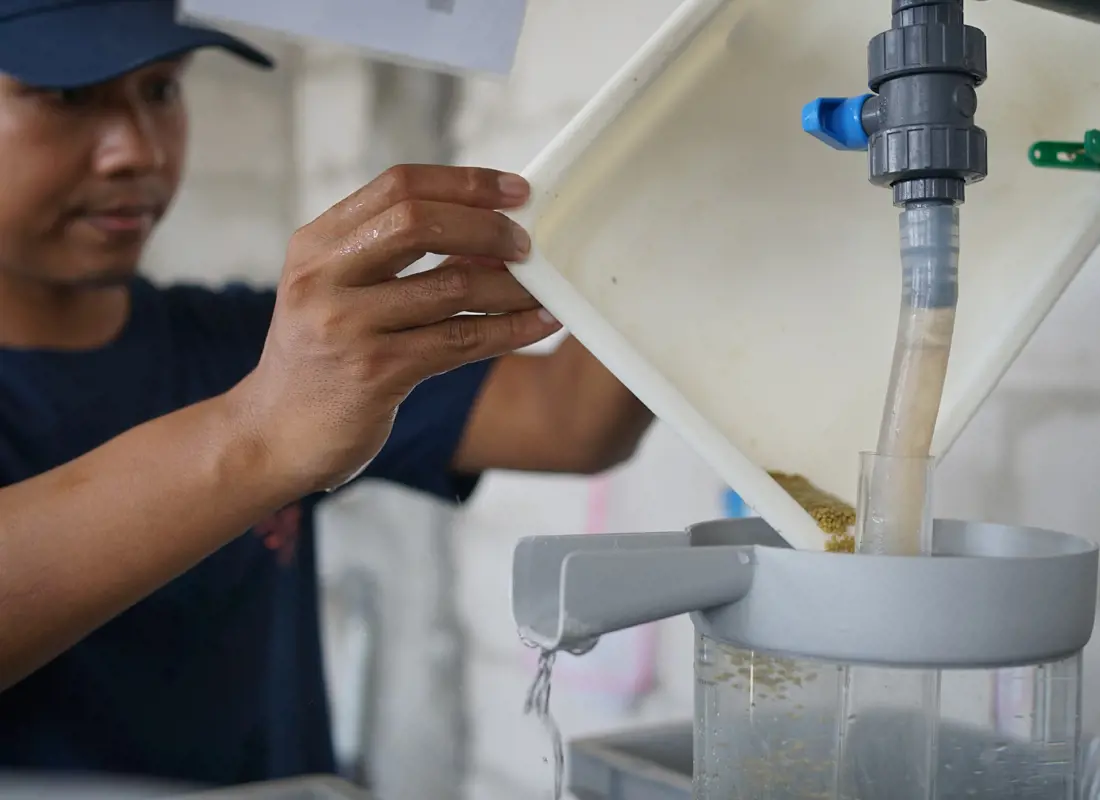 Budi: "These NMT fry are also more uniform in size than hormone-treated fish. In a tilapia hatchery, you normally wait until the newly born fry float to the surface of the pond and collect them after about 18 days regardless of their age. With NMT fry, we can collect the eggs every 10 days, grade them into four groups based on their stage of development and make sure they're uniform in size. This benefits fish farmers as well. You can't do this with hormone-treated fish."